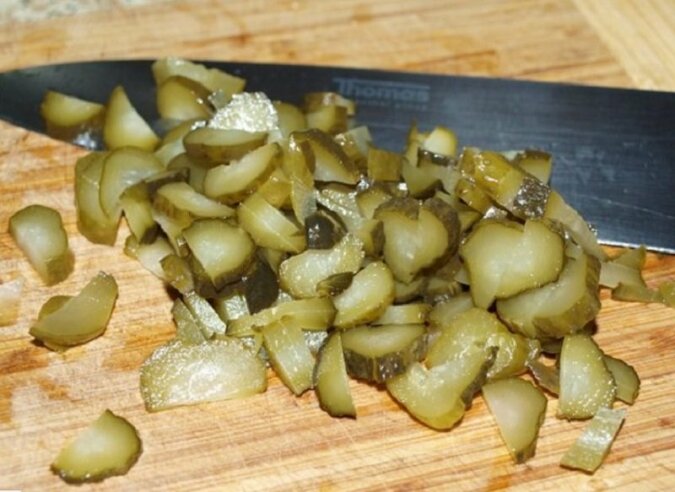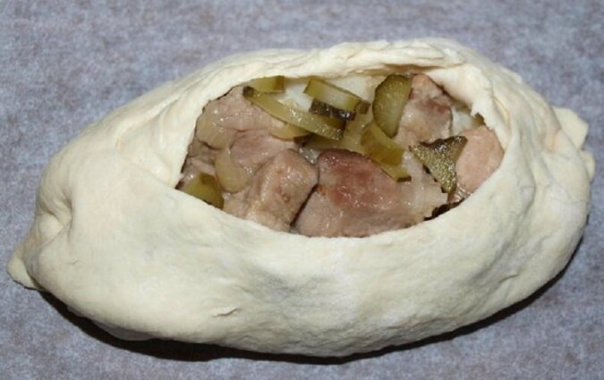 Po rozmrożeniu ciasto podziel na kwadratowe kawałki, a następnie rozwałkuj je wałkiem do ciasta. Na środku każdego kwadratu umieść trochę ziemniaków, plastry usmażonego mięsa oraz ogórki. Wykonaj cięcia wzdłuż każdego boku ciasta.