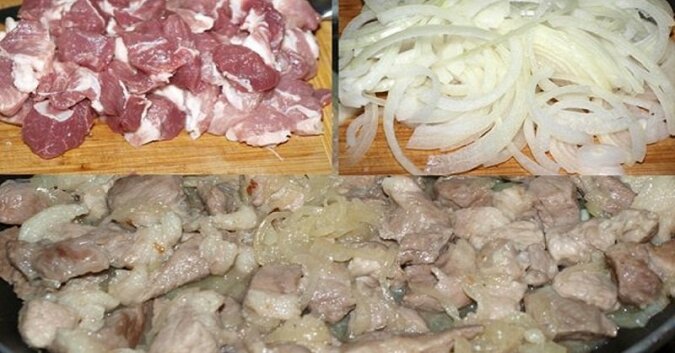 Mięso pokrój w plastry i usmaż na patelni wraz z krążkami cebuli.