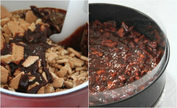 Do formy do pieczenia włóż masę czekoladową z ciastkami biszkoptowymi, a powierzchnię wyrównaj.