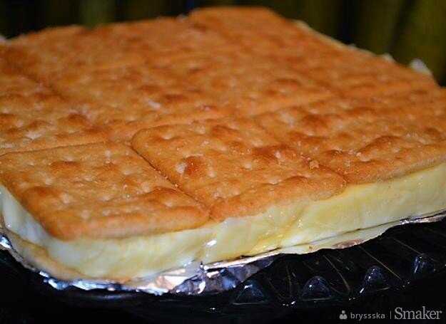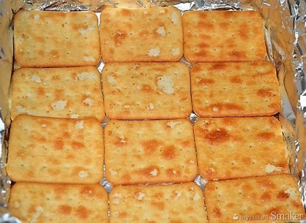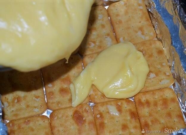 6. Przykrycie wylanego kremu kolejną warstwą krakersów.