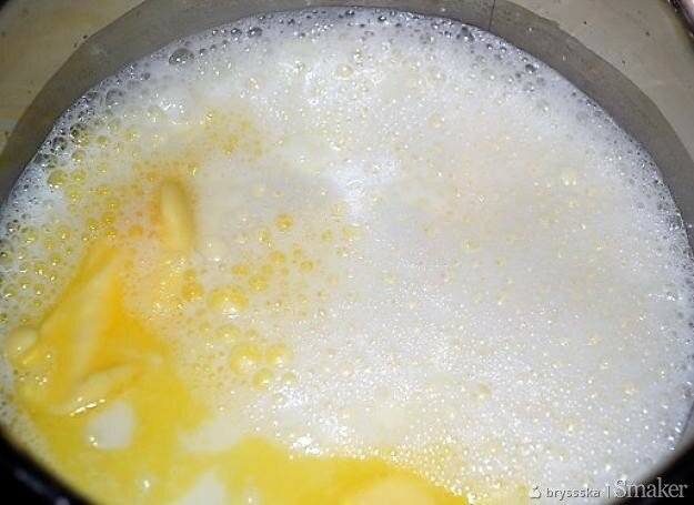 2. Zagotowanie połowy mleka z dodatkiem cukru zwykłego, cukru waniliowego oraz masła.