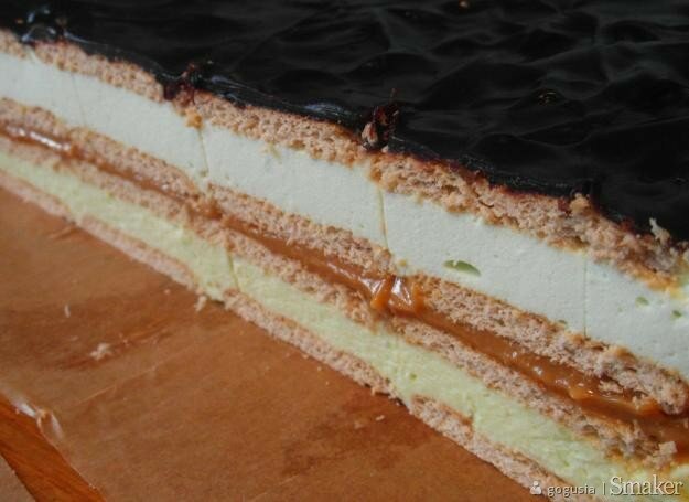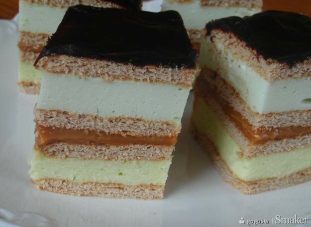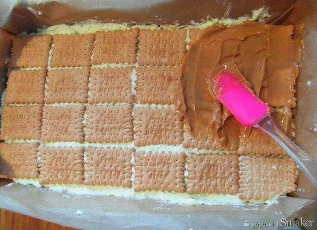 5. Wyłożenie masy na herbatnikach, ułożenie na niej kolejnej warstwy herbatników oraz wylanie masy kajmakowej i przykrycie herbatnikami.