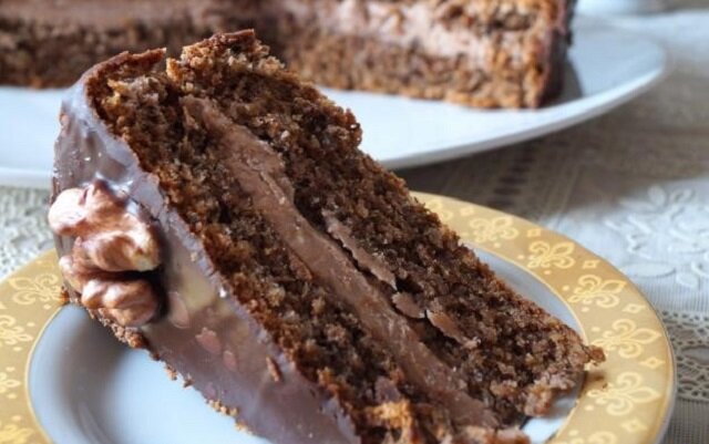 3. Wysmarowanie ciasta ostudzoną polewą oraz ozdabienie połówkami orzechów.