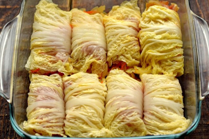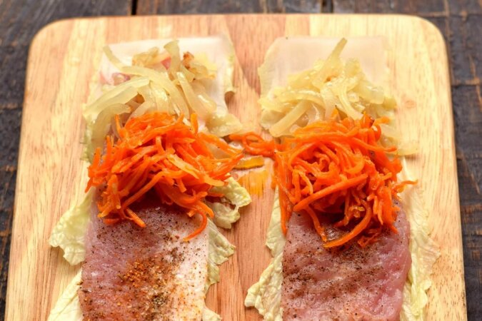Połóż paski mięsa na wierzchu i połóż łyżkę cebuli i marchewki na krawędzi liścia kapusty.