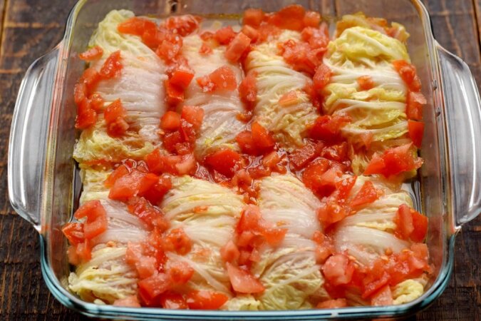 Zalej je szklanką wody, na wierzch ułóż pomidory, pokrojone w drobną kostkę.