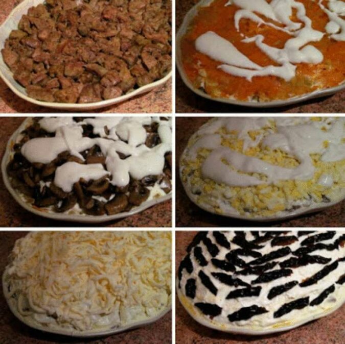 Cudownie pyszna sałatka z wątróbką drobiową! Smak jest bardzo harmonijny, a połączenie wątróbka + pieczarki + śliwki jest w sam raz! Ale główną „zaletą” tej sałatki jest brak majonezu... zamiast niego użyłam sosu ze śmietany i sera feta.