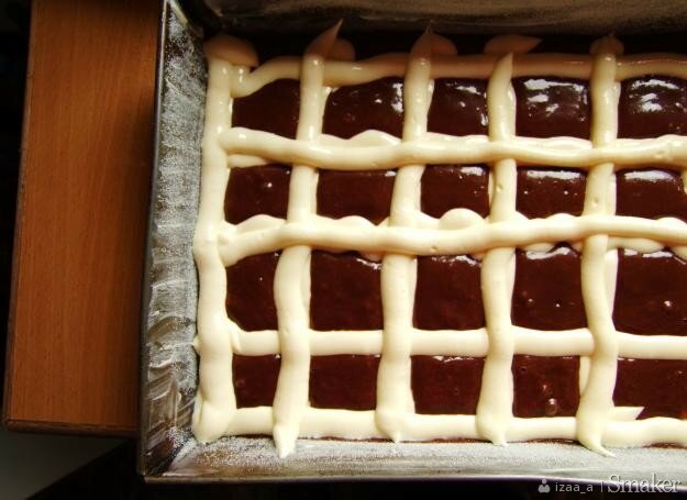 Zmiksować ser z dodatkiem budyniu i cukru do jednorodnej konsystencji. Przełożyć masę do rękawa lub do woreczka foliowego. Uciąć róg i płynnym ruchem narysować pionowe i poziome kreski. Na powierzchni powinna utworzyć się w miarę równa kratka. Kiedy powtarzasz przepis już któryś raz, możesz wymyślić nowy wzór lub nawet coś napisać.
