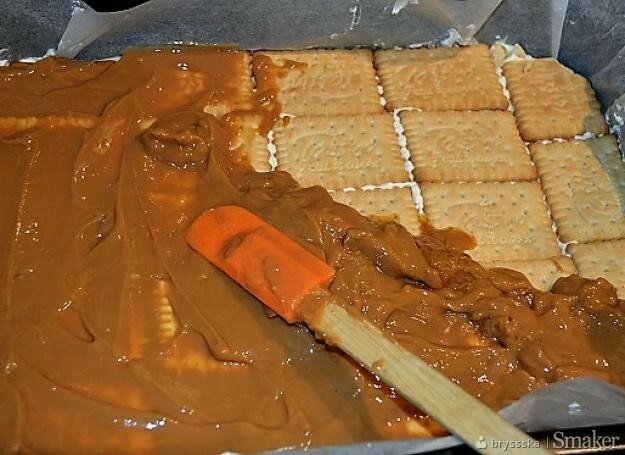Kolejno ułożyć warstwę herbatników, a następnie wysmarować warstwę masy krówkowej z puszki.