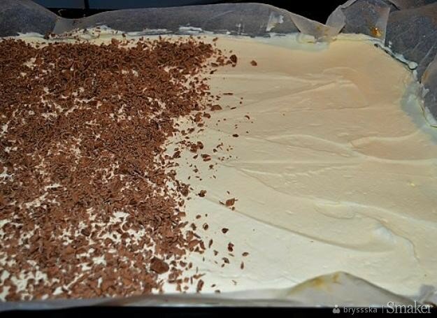 Czekoladę zetrzeć na tarce, a następnie obsypać nią górę ciasta. Aby ciasto stężało, a ciastka rozmiękły wstawić ciasto do lodówki na kilka godzin.