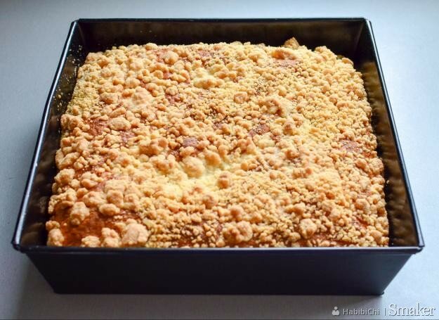 Kiedy ciasto już wyrośnie, dodać rodzynki. Można pominąć ten krok. Formę 24 × 25 cm wysmarować margaryną lub masłem. Wyrobione ciasto przełożyć do formy i odstawić na dodatkowe 15 minut. W tym czasie ciasto nabierze jeszcze trochę objętości i będzie bardziej puszyste. Kruszonkę wyjąć z lodówki i posypać nią ciasto. Piekarnik rozgrzać do 180 stopni i piec około 40 minut, aż do zarumienienia. Aby mieć pewność, że ciasto jest w środku upieczone, można użyć drewnianego patyczka lub zapałki. Jeśli po włożeniu w ciasto jest suchy, to należy je wyjąć z piekarnika.