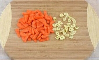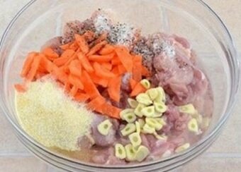 4. Do tej samej miski włóż mięso, marchewkę, czosnek, sól i pieprz. Dobrze wymieszaj.
