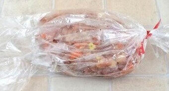 6. Rękaw umieść w naczyniu żaroodpornym, wlej żelatynę i zawiąż rękaw z drugiej strony.
