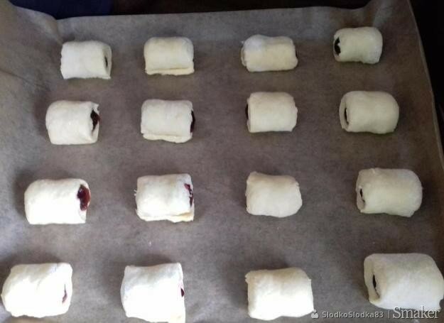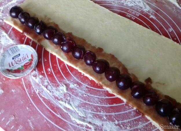 Następnie należy wszystko posiekać nożem. Szybko zagniatamy ciasto, a zatem rozwałkowujemy go na delikatnie podsypanym mąką blacie, na grubość około 8 mm. Brzegi ciasta smarujemy powidłem lub dżemem z wiśni. Teraz układamy wiśnie jak jest pokazane na zdjęciu. Następnie delikatnie zwijamy ciasto. Kroimy roladę na kawałki, formujemy ciasteczka, a zatem układamy na blasze do pieczenia, wyłożonej papierem do pieczenia. Piekarnik rozgrzewamy do porządnej temperatury – 180 stopni Celsjusza. Pieczemy ciasteczka przez 20 minut aż lekko się zarumienią. Smakołyki są gotowe! Wyjmujemy z piekarnika, posypujemy cukrem pudrem i podajemy. Palce lizać.