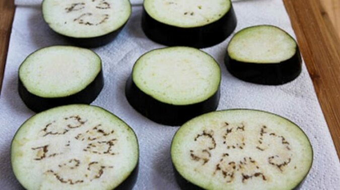 Wyciągnij krążki bakłażana z wody i osusz papierowym ręcznikiem. W międzyczasie rozgrzej piekarnik do 180 stopni.