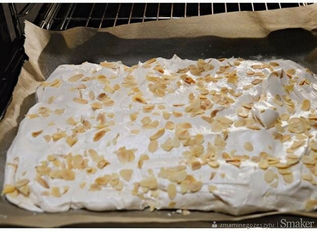 Przygotowujemy 3 białka jajeczne, a następnie ubijamy je na pianę, stopniowo i powoli dodając cukier, cały czas kontynuując ubijanie. Pod koniec ubijania wsypujemy budyń, cały czas delikatnie mieszając. Markierem lub flamastrem odrysowujemy kontury blachy na papierze do pieczenia (pergaminie). W obrębie tych konturów wykładamy gotową pianę z białek, a następnie powierzchnię posypujemy płatkami migdałowymi. Bezę wkładamy do piekarnika nagrzanego do 140 stopni Celsjusza i pieczemy przez 1 godzinę i 20 minut, do momentu zarumienienia się ciasta. Po upieczeniu ciasto należy przestudzić i podawać. „Malinowego Króla” należy trzymać w lodówce.