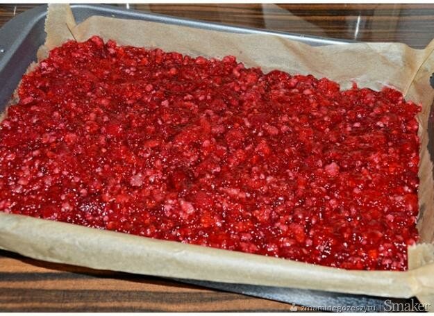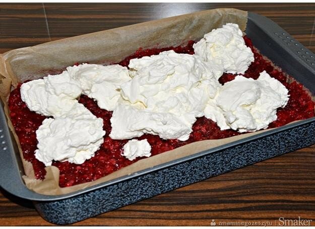 Galaretki malinowe należy rozpuścić w gorącej wodzie, następnie przestudzić, a zatem powoli wsypać maliny. Wszystko dokładnie wymieszać. Masę malinową wylać na spód ciasta, zatem powierzchnię lekko wyrównać, a następnie wstawić do lodówki na min. około 1 godzinę. Warto zauważyć, że w przypadku, jeśli wykorzystujemy maliny mrożone, trzeba działać dość szybko, żeby galaretka nie była już zastygnięta w momencie, gdy zamierzamy włać ją na blachę.