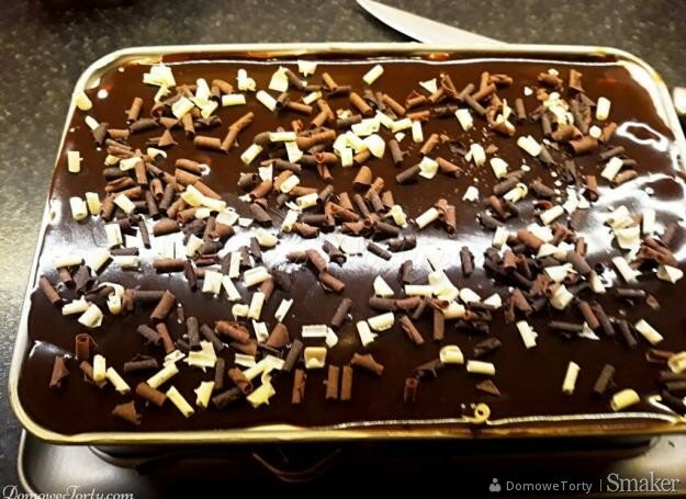 Po dziesięciu min., kiedy polewa już prawie zastygnie, ale będzie jeszcze klejąca – posypuj ciasto posypką czekoladową.