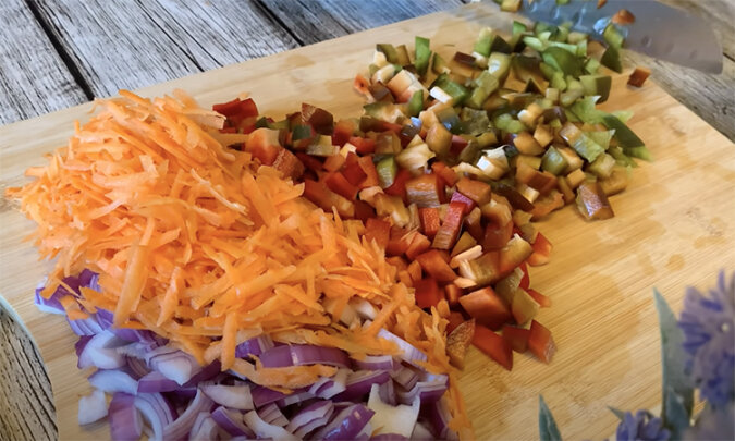 Cebulę i paprykę pokrój w mniej więcej równą kostkę, czosnek posiekaj nożem, a marchewkę zetrzyj na tarce. Smaż wszystko razem na średnim ogniu, po 3 minutach dodaj ryż do warzyw, posól i zalej wodą tak, aby tylko przykryła ryż. Przykryj i pozostaw na 15 minut. Po wyznaczonym czasie posyp wszystko startym serem i nadzienie jest gotowe.