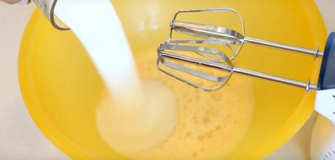 Ubij jajka ze szczyptą soli na małej prędkości, aż masa się powiększy. Wsyp cukier i dalej ubijaj przez 5 minut, aż do uzyskania jasnej i puszystej konsystencji.