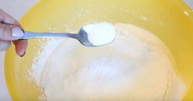 Wlej kefir i masło do miski i wymieszaj jeszcze trochę za pomocą trzepaczki lub miksera na małej prędkości. Przesiej mąkę i dodaj sodę oczyszczoną.