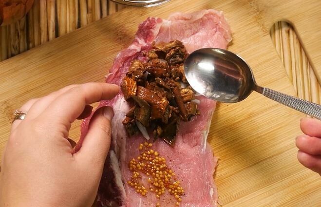 Do każdej kieszonki nałóż odrobinę musztardy, pokrojonej cebuli i grzybów. Zlep brzegi jak na filmiku, delikatnie obtocz w mące, rozmąconym jajku i bułce tartej. Zapiekaj przez około pół godziny w temperaturze 190 stopni Celsjusza.