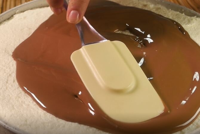 Czekoladę rozpuść w kąpieli wodnej lub przy użyciu kuchenki mikrofalowej. Dodaj olej kokosowy lub łyżkę masła. Dokładnie wymieszaj polewę pozbawioną grudek, wylej ją na ciasto i porządnie schłódź. Poczekaj, aż czekolada stężeje.