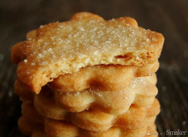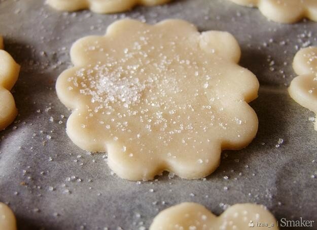 Ciasteczka rozłóż na blaszce wyścielonej pergaminem, posyp drobnym cukrem.