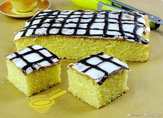 7. Dokładne utarcie cukru pudru z dodatkiem soku z cytryny oraz pokrycie nim wystudzonego ciasta.
