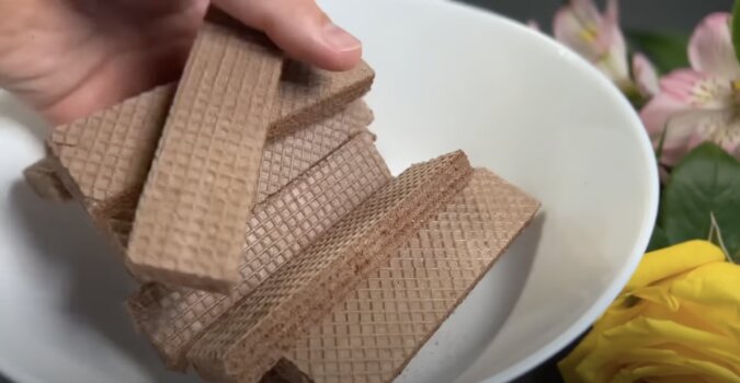 1. Wafelki czekoladowe (200 g) przełóż do naczynia.