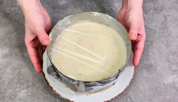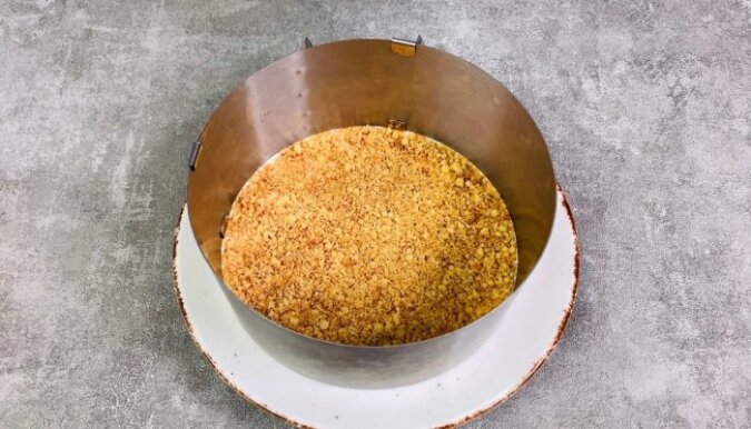 Zbierz tort: na dnie formy ułóż kruszonkę, następnie rozprowadź warstwę kremu. Powtarzaj warstwy aż do skończenia wszystkich składników. Ostatnią warstwą powinna być warstwa kremu.