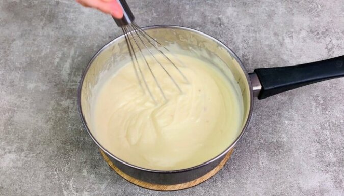 Aby przygotować krem, ubij jajka w rondelku, dodaj cukier, cukier waniliowy i skrobię kukurydzianą. Ubijaj wszystkie składniki aż do uzyskania piany.