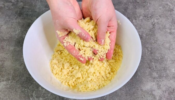 W dużej misce wymieszaj przesianą mąkę z cukrem. Dodaj masło (należy wcześniej zetrzeć na tarce) i dokładnie wymieszaj, aby uzyskać kruszonkę.