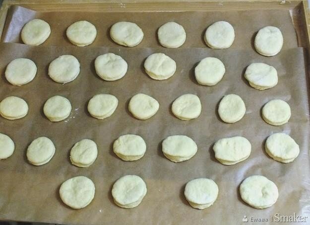 Podziel je na dwie równe części. Jedną część przykryj ręcznikiem, by nie straciło wilgoci i odstaw w stronę. Drugą część ciasta wałkuj na delikatnie (!) posypanym mąką blacie na placek o grubości 1 – 1,5 centymetra. Użyj szklanki do wykrojenia kółeczek.