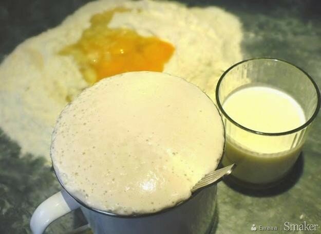Do ciepłego mleka dodaj drożdże i rozprowadź. Następnie dodaj jedną łyżeczkę cukru i jedną niepełną łyżkę mąki, dobrze wymieszaj i pozostaw w cieple, aż napęcznieje.
