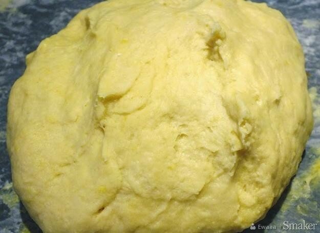 Po tym, jak roztwór w miarę urośnie, powoli dodawaj go do mąki na przemian z ciepłą maślanką i spirytusem, i zagniataj ciasto.
