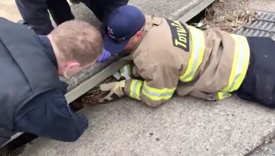Po kilku chwilach ratownicy uspokoili jelonka i usunęli go z kanału. Gdy jelonek myśli o tym, co się stało, ratownicy trzymaja go i głaskają.