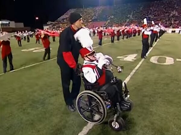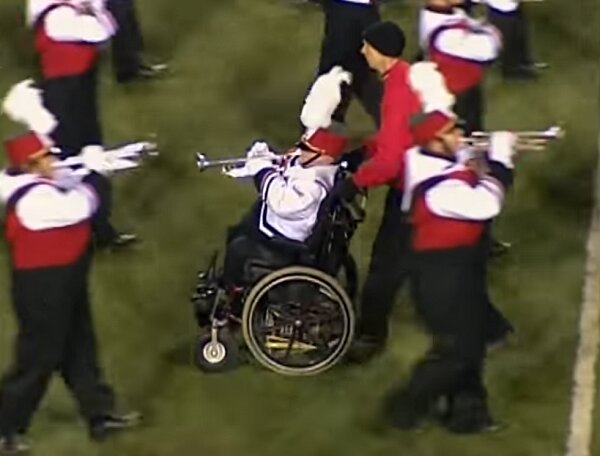Dołączając do 214 innych członków orkiestry, Patrick grał na trąbce, a jego tata sumiennie mu pomagał.