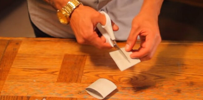 1.Najpierw trzeba spłaszczyć rolkę, aby uzyskać elipsę. Następnie pokroić ją w paski o szerokości 2-3 cm.