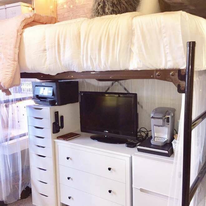 Okazało się, że kluczowe było zakupienie odpowiedniego sprzętu i umieszczenie łóżek ponad powierzchnią podłogi. Dzięki temu ich rzeczy, szafki, drukarki, ekspres do kawy już bez problemu zmieściły się w pomieszczeniu.