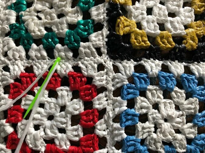 Ale montaż gotowego produktu z kwadratów jest już czymś trudniejszym niż samo dzianie, bowiem to nie tylko zwykłe nici do dziania, ale plastikowe, dlatego rozciągają się, a niejednokrotnie wręcz się rozrywają.