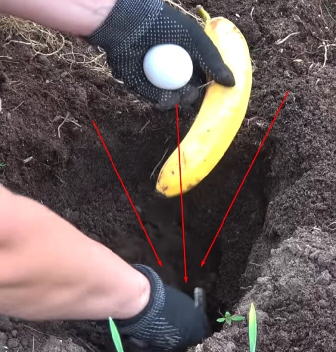Zacznijmy więc od przygotowania naszej ziemi do sadzenia. Osobiście, sadzę pomidory w otworze o średnicy czterdziestu lub czterdziestu pięciu centymetrów. Lepiej jest dodać kompost i biohumus do dziury, aby pomidory mogły być lepiej odżywione. Przedstawmy teraz nasze sekrety. Tajemnicą jest BANAN I JAJKO. To nie żart. Banan jest naprawdę bardzo użytecznym nawozem organicznym, który będzie odżywiał pomidory przez cały sezon. A jajko jest źródłem azotu i wapnia, pomoże naszym pomidorom rosnąć wielokrotnie szybciej i dawać 2 razy większe plony.