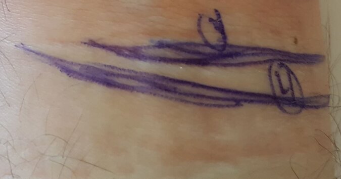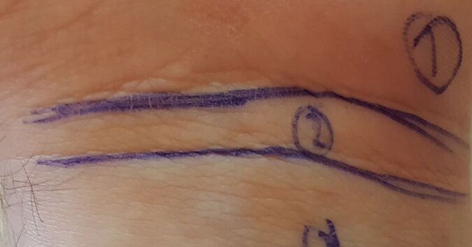 Jeżeli na kobiecym nadgarstku pierwsza linia się przerywa bądź nie jest prosta, oznacza to problemy z genitaliami oraz z ciążą. Jeżeli na męskim nadgarsku tak się dzieje, oznacza to problemy z płodnością oraz z prostatą.