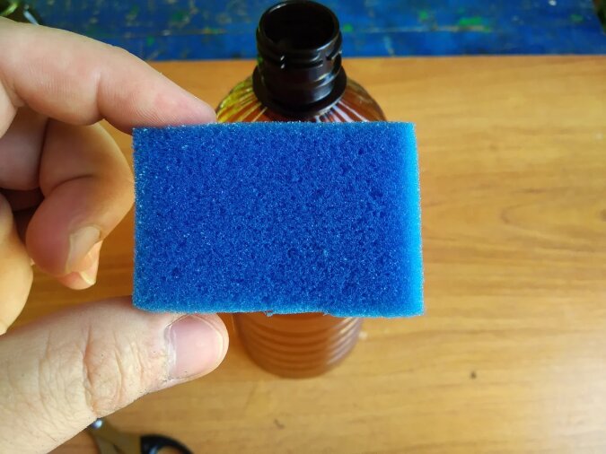 Ponieważ użyłem gąbki, będę o niej mówił, ogólnie rzecz biorąc, dzielimy szorstką część i przecinamy gąbkę na pół.