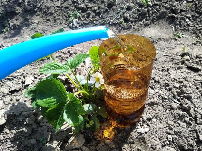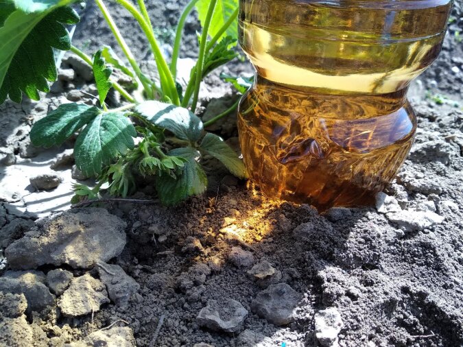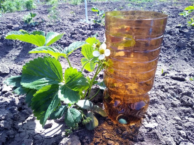 Teraz idziemy do grządki i przypinamy szyjką w dół tuż obok sadzonek lub, jeśli są one posadzone niedaleko od siebie, między nimi. Nie ma potrzeby zakopywać jej głęboko, najważniejsze jest to, żeby butelka nie spadła.
