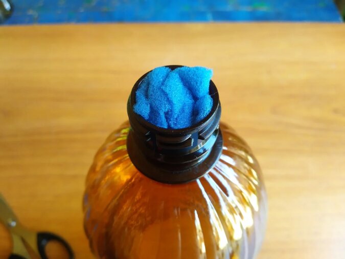 Zaczynając od środka, wciskamy ją w szyjkę butelki, nie musi być głęboko, najważniejsze jest to, że nie wypada i siedzi szczelnie.