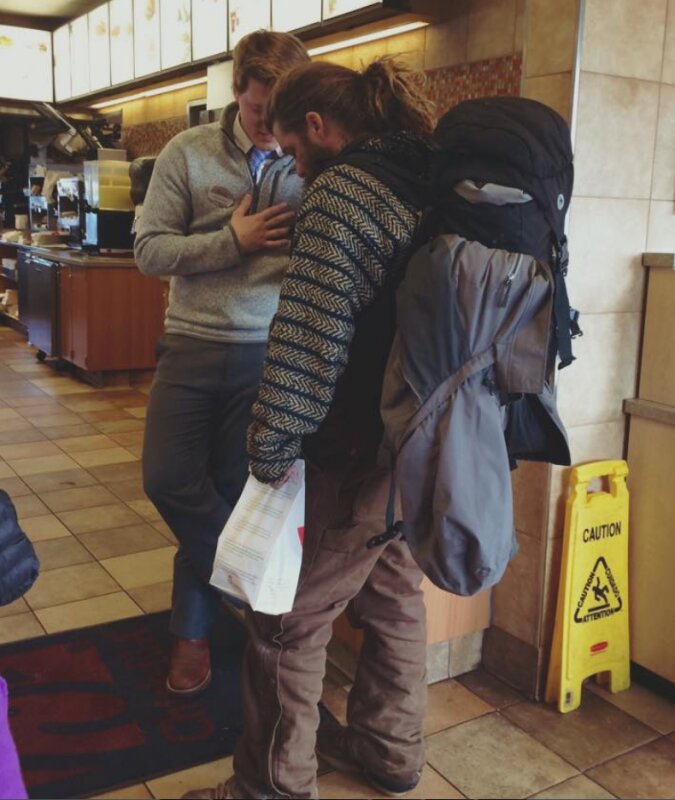 „Poszedłem dzisiaj z córeczką do jednej z restauracji. Gdy skończyliśmy jeść, pozwoliłem jej pójść na plac zabaw, żeby się chwilkę pobawiła, a następnie powiedziałem jej, żeby wróciła na deser. Siedzieliśmy przy stoliku, mając widok na calutkie miejsce. Wtem ujrzeliśmy tą sytuację. Pewnien bezdomny podszedł do jednego z pracowników i spytał go o jakieś możliwe resztki jedzenia, bo jest bardzo głodny. Wyglądał słabo, nie był wykąpany, a jego ubrania oraz buty byłe całe w błocie. Miał on jako tako związanego kucyka i był porządnie zarośnięty, co wskazywało na to, że golił się ostatni raz bardzo dawno temu. Zwracał on uwage każdej osoby obecnej w restauracji, jednakże on czekał spokojnie.