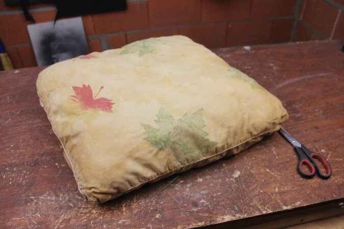Podczas gdy szmaty są przemoczone, bierzemy starą poduszkę wypełnioną poliestrem.