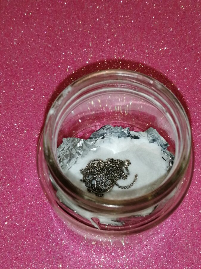 Wkładamy folię (zwiniętą 4 razy) na dół szklanego pojemnika, wsypujemy 1 łyżeczkę sody oczyszczonej. Na sodę kładziemy srebrną rzecz (u mnie był łańcuszek z wisiorkiem).