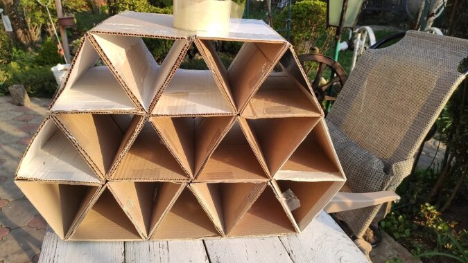 Mój projekt składa się z trójkątnych komórek połączonych ze sobą. W każdej sekcji są trzy kartony.