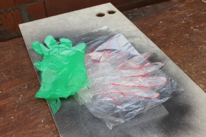 Lutujemy i jednocześnie wycinamy za pomocą lutownicy z „kółkiem”. W wyniku otrzymujemy jednorazowe rękawiczki.